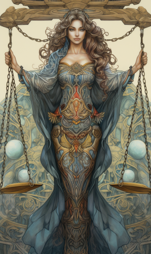 colored Pencil, very detailed, dinamic colors, Justice from a Tarot Deck, fantasy elements --ar 897:1497