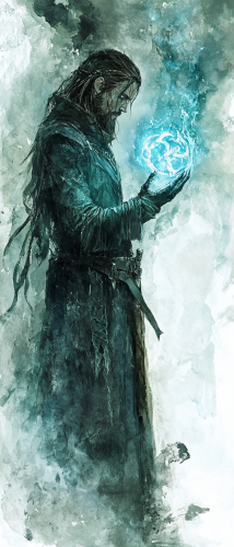Dragon-man cleric holding a glowing blue rune symbol. Dark Fantasy setting. The mood is ethereal. Watercolor art style. Watercolor background with partial white space. --ar 3:7