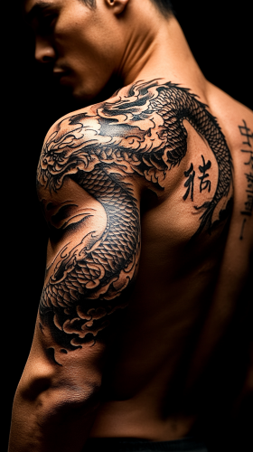 A man raising his left arm high, showing a black fire dragon tattoo. The dragon’s mouth is positioned on the hand, with its body flowing down the arm and extending across the back. On his back, the dragon's tail coils around a Chinese character '忍' (meaning 'perseverance'). Highly detailed, traditional Asian tattoo style, intense shading and linework, realistic lighting, --ar 9:16