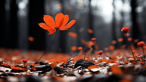asheville North Carolina. Fall. Autumn. Peak leaves. Abstract minimalist. Mirage effect. Extreme low angle shot. Worm’s eye view.Black and white photograph with vibrant autumn color splash. High-end. Stylish. Important. Mysterious. Black and white. Shot with a Pentax. K-3 III Monochrome. --ar 16:9 --q 0.5 --s 750