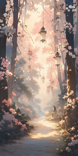 **beautiful spring flower garden painting in the background is a white gazebo, ar 16:9, --s 750 --v 5.2