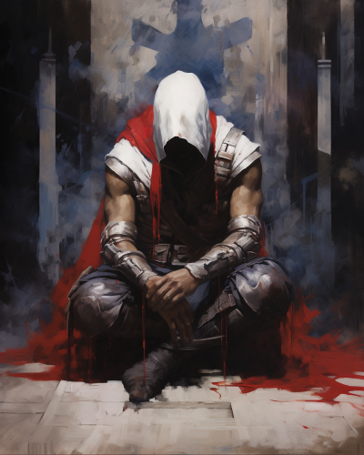close up shot, painting by ashley wood of assassin's creed kneeling down wearing red white and blue --ar 4:5