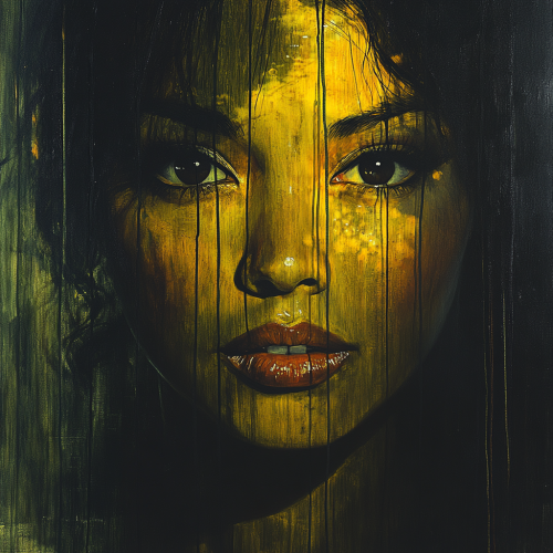 Beautiful painting of Asian woman portrait on canvas oil on dark background, brushstrokes, double exposure, surrealism, heavy use of palette knife, chiaroscuro lighting, dramatic shadows, atmospheric perspective, Zbigniew Bekszynski style. --v 6.1 --s 888 --chaos 30