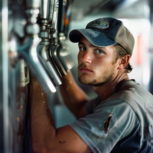 draft beer line cleaning person, white young midwestern man, wearing a blue trucker hat, working, photography