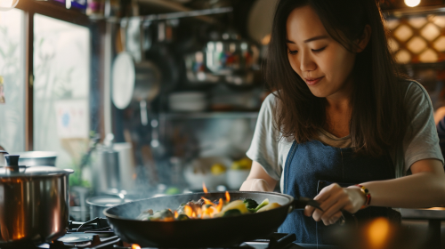 this is a luxury kitchen, miller appliance, real photo, lots of nature light, beautiful south Asian lady is cooking, photo captured by canon EOS 5D mark
