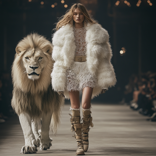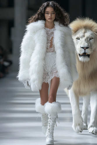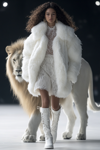 At the fashion week of the 2030s, a amazon model wore a fluffy white lace down jacket with an exaggerated skirt, paired with Yves Saint Laurent style leather boots, walking on the runway for a full body photo in high definition and high resolution. next to the model a white lion with a magnificent coat parades alongside and protects the model --ar 2:3 --s 250