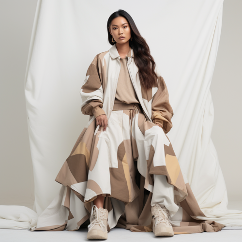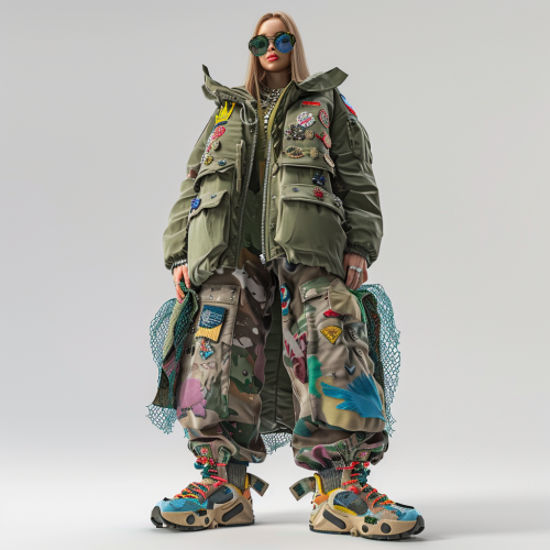 3D rendered vinyl very extreme exaggerated features attractive streetwear model girl wearing a massive very exaggerated giant oversized aviator jacket with war patches and award pins with giant very oversized colorful cargo pants with multiple giant net pockets over blue bird patches and giant extremely oversized Yeezy brand running shoes made of dream shaman spirit frog shaman on a white background multiple views of model