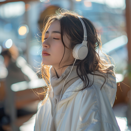 In the sunshine, an Asian female fashion model wearing a white jacket immersed in the music atmosphere --style raw --s 250