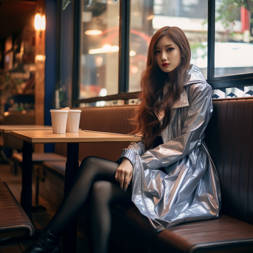 photo of a beautiful tall slim young japanese female model, long hair, wearing medical exam gloves, jacket, leggings, sitting, cafe, street photography