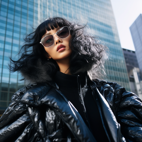 High fashion editorial photography. strange angle. A woman Asian women, Hong Kong and Singapore women. wearing a black plastic fur robe, in the style of kawaii.The background is the building district of Marunouchi, Tokyo, Japan in broad daylight. Sunlight is diffusely reflected on the countless window glasses, spotlighting the model from multiple angles.--ar 9:16