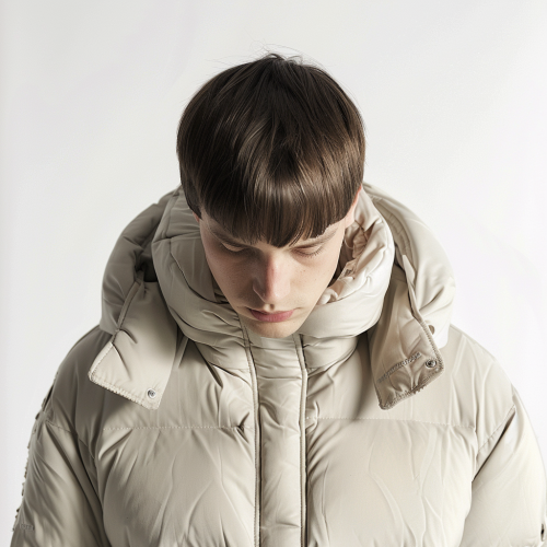 man, top model, blond hair, full-length photo, in a clothing store exquisite white jacket with orange zipper in front, fashionable pants white with orange inserts, printed on a 3D printer, full-length. There are people in the background. Balenciaga style. Highly detailed and hyper-realistic. Beautiful sets, creative lighting. On the side we see a participant of the show with professional studio light, 8k , --ar 16:9 --stylize 900 --v 6.0 --style raw