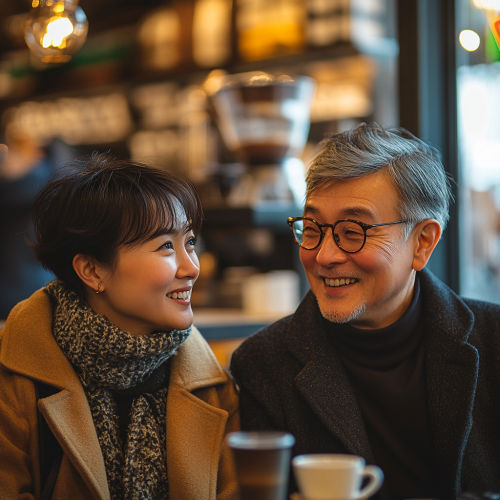 an Asian professional women with short hair, dressed casual coat drinking a coffee with her partner, who is a senior Geremany in Scandinavia coffee store, --s 250