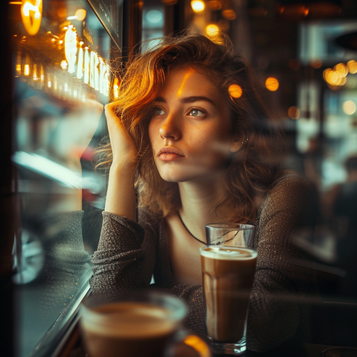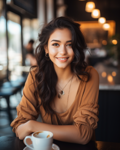 asian woman and man drinking some cup of coffee with smile, coffee shop lounge background, various angle , unreal gesture, super long shot, ultra realistic, --ar 16:9