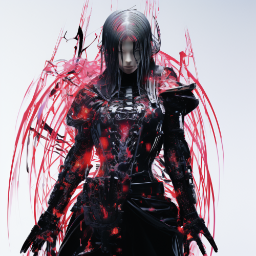 a side kick Android Ninja Suki radiating energy, bobble head creature , weird looking, freaky Glitch, got a fling with its thing, detailed --v 6.0 --ar 2:3 --no letters