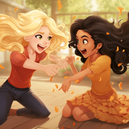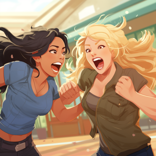 a fighting between between two girls. One is black-haired Asian girl knocked down a rich girl with long curly blond hair with one punch, and the blond girl was stepped on the ground by the Asian girl. Black-haired Asian girl is laughing, blonde girl has a painful expression and is crying. No background. ar 1:1