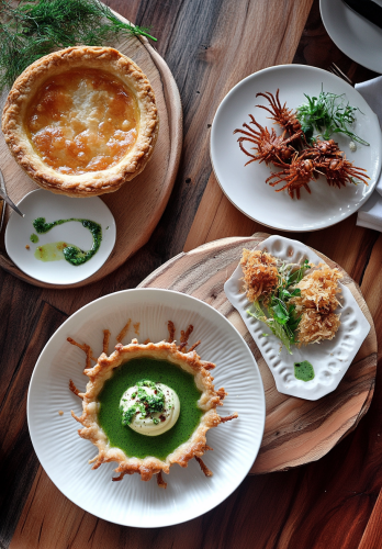 ultra chic modern restaurant table setting of plated spider pie with golden flaky pastry green gravy and a side dish of crispy fried cockroaches --ar 100:143 --s 15 --w 2