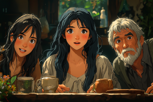 anime, hand-drawn and cell animation techniques, an asian girl with a sad expression being lectured by her parents at the dinner table, natural design, beautifully rendered and expressive rich colors, vibrant pastel colors, imaginative and fantastical landscapes, sharp attention to detail, realism and a strong sense of nostalgia and warmth, sharp attention to small details and textures, fantastical creatures, settings, depth and emotions emphasized and accentuated by lighting and shading, extremely high quality, incredibly high finite definition, high resolution, hand-drawn and cel animation techniques, anime --ar 3:2 --stylize 1000 --q 2