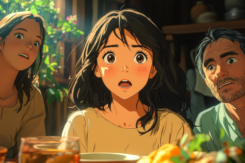 anime, hand-drawn and cell animation techniques, an asian girl being lectured by her parents at the dinner table, natural design, beautifully rendered and expressive rich colors, vibrant pastel colors, imaginative and fantastical landscapes, sharp attention to detail, realism and a strong sense of nostalgia and warmth, sharp attention to small details and textures, fantastical creatures, settings, depth and emotions emphasized and accentuated by lighting and shading, extremely high quality, incredibly high finite definition, high resolution, hand-drawn and cel animation techniques, anime --ar 3:2 --stylize 1000 --q 2