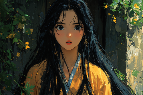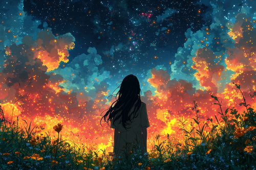 anime, hand-drawn and cell animation techniques, a wide-shot of an asian girl with long black hair standing and looking up at the sparkly night sky, natural design, beautifully rendered and expressive rich colors, vibrant pastel colors, imaginative and fantastical landscapes, sharp attention to detail, realism and a strong sense of nostalgia and warmth, sharp attention to small details and textures, fantastical creatures, settings, depth and emotions emphasized and accentuated by lighting and shading, extremely high quality, incredibly high finite definition, high resolution, hand-drawn and cel animation techniques, anime --ar 3:2 --stylize 1000 --q 2