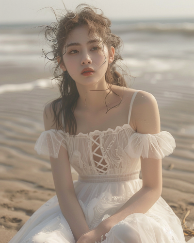 asian girl on the beach wearing a white dress, in the style of xiaofei yue, hazy, dreamlike quality, fairycore, 32k uhd, light orange and dark gray --v 6.0 --ar 4:5