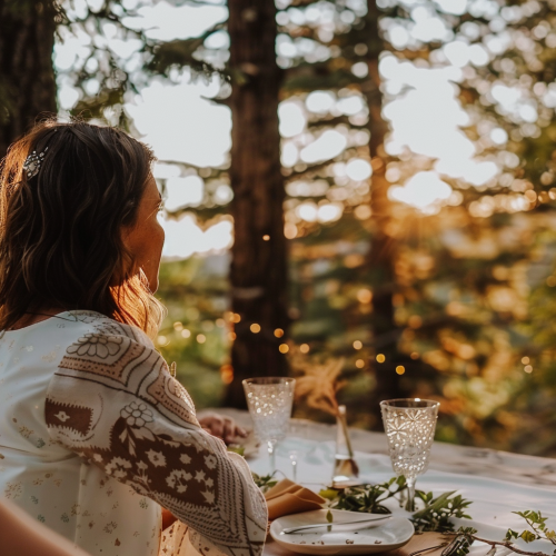 Close-up of a guest in a contemplative moment, enjoying nature at an outdoor dinner table, blurred forest backdrop, elegant decor, natural lighting, peaceful, realistic photo --v 6.0 --s 50