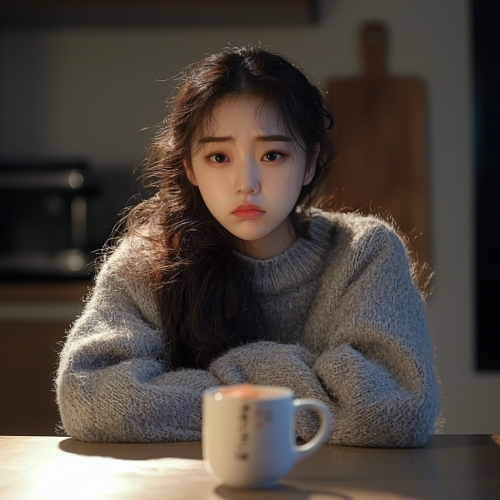 beautiful Korean girl, about 19 years old, in a gray fluffy sweater, angry, sitting at the table, arms crossed, a mug of tea on the table, evening, kitchen --q 2
