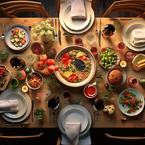 photorealistic christmas dinner table. light and happy colors. day. picture is made from the top. top view pov. wine is on the table. no people