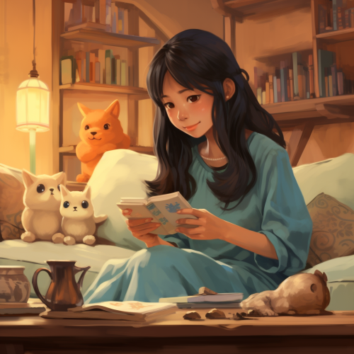 with ghibli studio stylise, Jenny, asian long hair girl,seated at her living room coffee table. She's playing her smartphone .