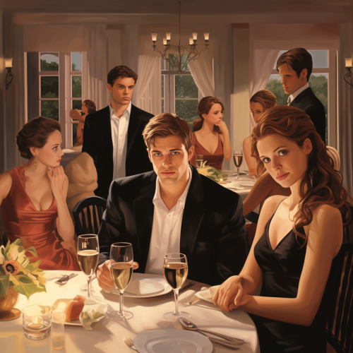 have both people from this photo sitting at a long dinner table. Also have a tall handsome well built man dressed in a black fitted dress shirt, also include a second woman sitting at the table who looks bored, is also in a dress, athletic looking, and has brown hair