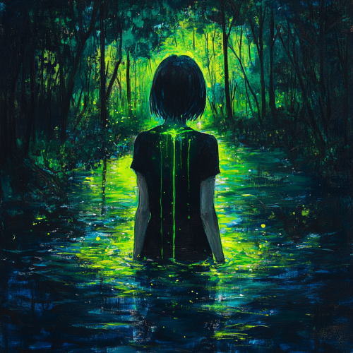 girl standing ankle deep in a river in a forest a night. she is staring straight at you. Her hair is a short black bob. her arms are loosely by her side, and he hands have a bright glittery neon emerald paint dripping from them into the water. This bright neon paint is the main light source.