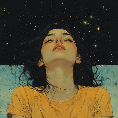 face of an indian woman wearing a tshirt laying on the roof of a building staring up at the stars at night in the style of Tatsuro Kiuchi, minimalism, simple --v 6.1 --s 750