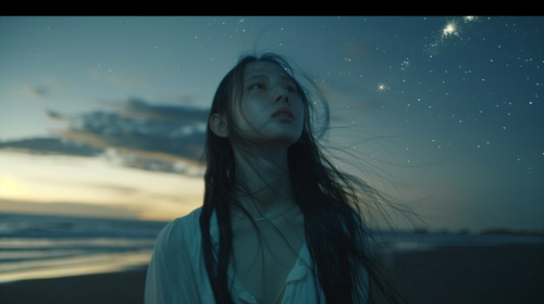 A Japanese woman with long black hair standing on a beach in the night sky. She is wearing a white shirt, but appears small because of the high angle.cinematic. --v 6.0 --ar 16:9