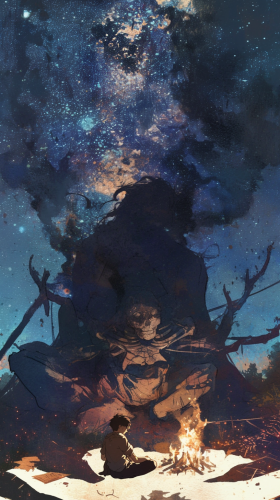 A picture using a more structured and bold watercolor style. A lone figure, sitting by a campfire under a starry sky, with a distant train whistle in the background. His worn-out clothes and weathered face show signs of exhaustion as he reflects on the long journey ahead. --ar 9:16 --niji 6