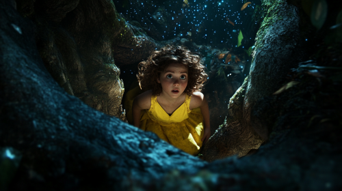 Sally, a young girl with curly brown hair,wearing a yellow dress, crouched in a small, enclosed space beneath a fallen tree, gazing up through a tiny hole in the canopy. Through the opening, the night sky is visible, filled with twinkling stars, casting a soft, serene light on her face. Her expression is a mix of wonder and fear, as the stars contrast with the tight, dark space around her. The surrounding jungle is barely visible, with dense foliage and shadows adding to the confined feeling. Animated, with vivid, ultra-realistic details emphasizing the contrast between the open sky and her enclosed space. . Animated, ultra realistic,. --ar 16:9