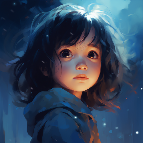 Children book illustration of adorable girl contemplating night sky in background, freckles, dark hair, big shining blue eyes, smile of surprise, close up, joyful, admiring beauty, poetic :: thick paint stri --ar 16:9 --niji 5