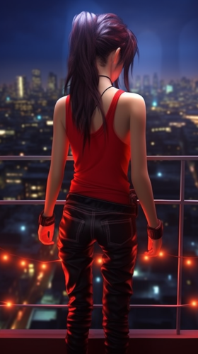 asian girl, back view, tied hair, skinny ripped jeans, crop tank top, waist gap in the jeans, staring at the night city view through a window, hyperrealistic, accent lighting, 4k, global illumination, red ambience light, low light --ar 9:16
