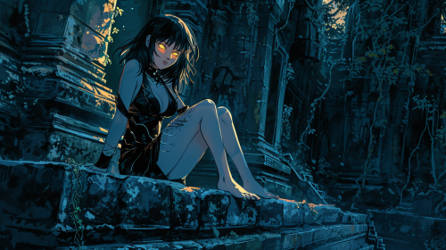 an illustration of a girl with messy black hair, pale white skin, a crooked smile, and glowing golden snake eyes, wearing a full body sci-fi black bodysuit and sitting on an ancient stone temple wall in Angkor watt staring at the viewer with a sardonic smile at night --ar 16:9 --v 6.0