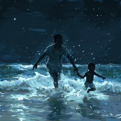 black teen boy and white smaller boy running out of the sea at night time