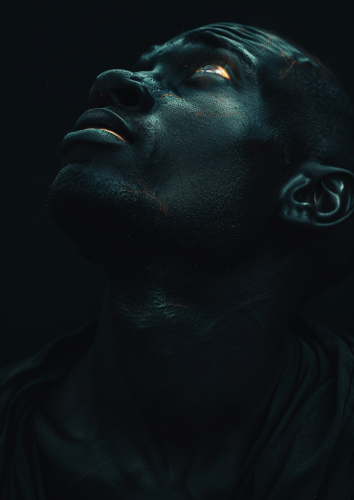 close-up of a glowing black human man looking sullenly at the sky with empty black eyes, mouth agape, over a black background, fantasy art style. --ar 5:7
