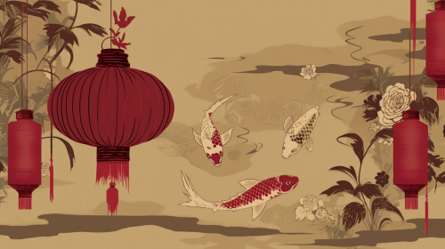 "Elegant Oriental Design with Bamboo, Koi Fish, and Lanterns with Sand Background": A panoramic oriental wallpaper with delicate bamboo, colorful koi fish, and traditional Japanese lanterns, all in shades of deep maroon-red (Pantone 19-1537 TCX) over a sandy beige background (Pantone ECE4D7). The koi swim gracefully near bamboo stalks, while lanterns illuminate the scene, adding elegance to the composition. --ar 16:9 --v 5.0