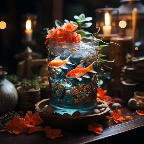 fishbowl as cocktail glass with koi fish inside, illustration, cocktail glass, koi fish --s 750