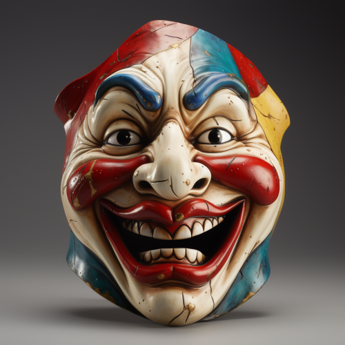 clown mask with a different emotion in each corner of the mask. Happy, sad, angry and tired facial expression