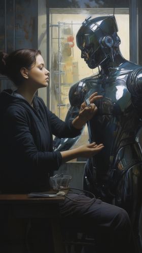 a woman with a cybernetic arm being checked by a technician in a workshop, realistic painting, --ar 9:16