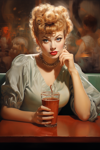 Lucille Ball in a 1950's diner having coffee by Gil Elvgren --stylize 250 --ar 4:6 --v 5.2