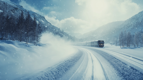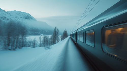 a speed train traveling fast through a snowy Norwegian landscape, bluish tones, 24 mm, realism image, cinematic style , hyper-realistic, highly detailed, daytime scene, atmospheric lighting, rich in detail, photography, high quality, --ar 16:9 --v 6.1