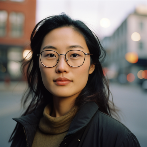 Asian woman with glasses in Oslo Norway, kodak portra 800; image split into 2, shot from different angles