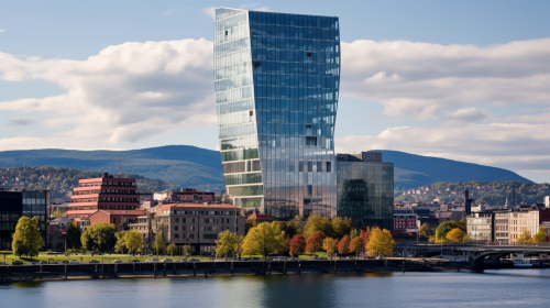 What: A photography of a beautiful and modern office building that is tipping over and about to collapse. The tower is located among other office in the city skyline of Oslo, Norway.. Background: City of Oslo. Type: Photography. The people involved must be gender-balanced and ethnically diverse. Perspective: From the fjord of Oslo. Style: Business professional. Genre: Empowerment. Purpose: For Power Point presentation. Colors that must be included: dark red, beige, white, black. Amount of minimalism: high. Feelings to evoke: kindness, Good, safety, freedom, optimistic, upbeat, personal, reassuring, motivating, professional, empathetic, understanding, inviting. Industry: financial. Constrasts and tones: High contrast, Warm temperature. Technical details: Photorealism, ultra realistic, photography, Color correction, Ultra-wide angle, Depth of field, Ultra-detailed, Beautiful Color coding, Crazy details, Complex details, Unreal Engine, Super Resolution, Megapixel, Pro Photo GB, VR, Natural lighting, Cinematic lighting, Backlighting, Octane rendering, High detail, Accent lighting, Full color, HDR, Anti-aliasing, FKAA, TXAA, RTX, SSAO, Shaders, OpenGL , GLSL Shaders, Post-processing, Post-production, Cell Shading, Tone mapping, CGI, VFX, SFX, award winning photography, studio lighting, Highly detailed and intricate, Rembrandt lighting. Aspect ratio: --ar 16:9