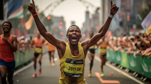A dynamic and vibrant image capturing the sheer exhilaration of a marathon runner crossing the finish line, his arms raised in jubilation, the sweat on his brow reflecting his exhaustive efforts. The backdrop is a sea of cheering spectators, their colorful attire and spirited banners creating a mosaic of excitement. Each spectator's face tells a story - some of joy, some of anticipation, others of shared triumph. The athlete's running attire, slick with sweat, clings to him, emphasizing his toned muscles and the strain of his endeavor. This moment of victory is frozen in time using a Sony A7R IV camera coupled with a FE 70-200mm f/2.8 GM OSS lens, celebrated for its bokeh capabilities and sharpness. To capture the runner's movement crisply while maintaining the vibrant background, settings are finely tuned with an aperture of f/3.5, ISO 400, and a shutter speed of 1/800 sec. The early morning sun creates a soft golden hue, highlighting the athlete while casting elongated shadows of the onlooking crowd, adding depth and contrast to the image. The result is an inspiring snapshot that epitomizes determination, endurance, and the euphoria of achievement. --ar 16:9 --v 5.0