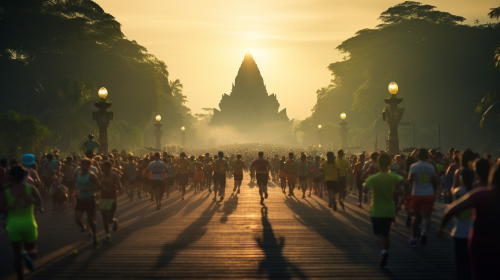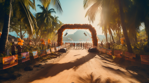 marathon finish line, tropical island scenery like in indonesia, marathon event, cinematic --ar 16:9
