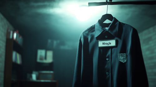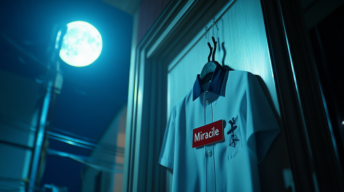 A Korean school uniform with a name tag that says 'Miracle' is hanging on a hanger in the room, and the moonlight at night illuminates the name tag, cinematic lighting --ar 16:9 --v 6.1